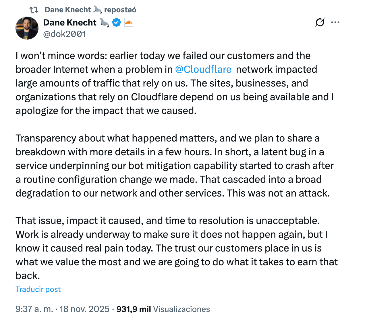El ejecutivo afirmó que Cloudflare publicará un informe técnico completo con la línea de tiempo del incidente y los cambios que implementarán para evitar que esto vuelva a ocurrir.