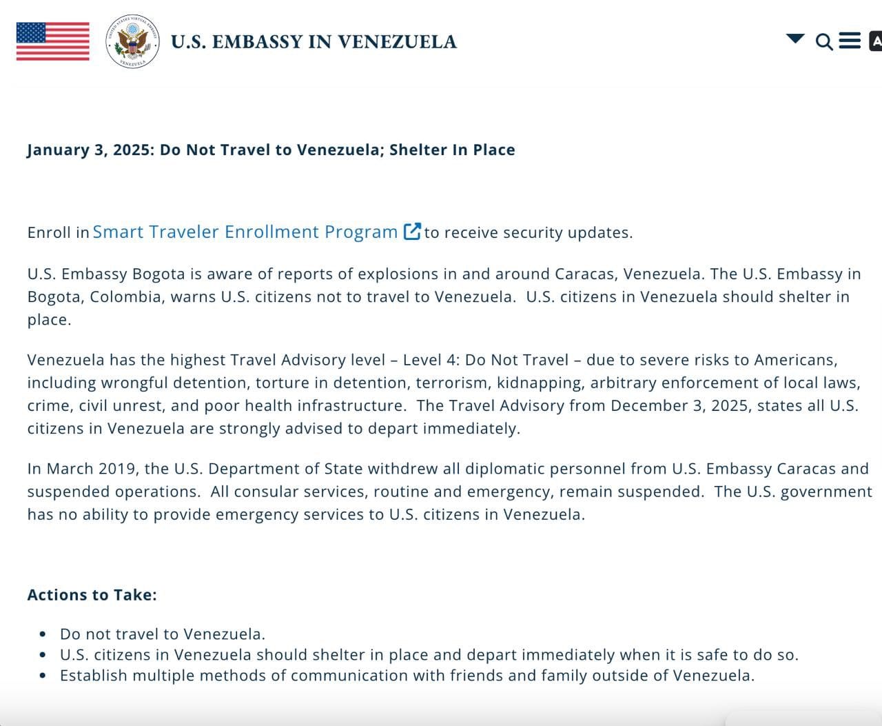 Como seguimiento a los reportes de bombardeos y a la creciente tensión en Venezuela, la Embajada de Estados Unidos en Venezuela emitió este 3 de enero una alerta de seguridad Nivel 4: “No viajar”, la más alta en su escala, y pidió a los ciudadanos estadounidenses refugiarse en el lugar donde se encuentren (shelter in place).