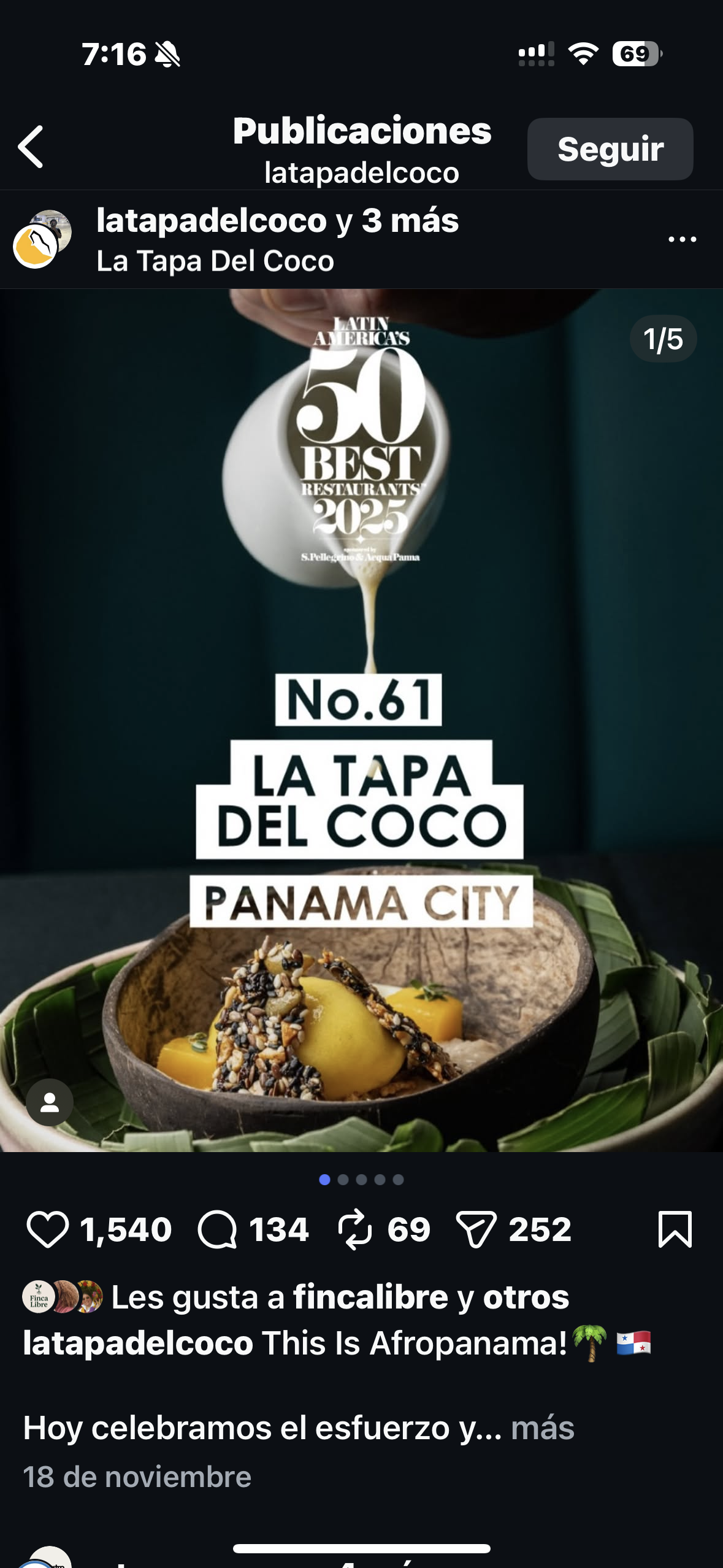 En la posición número 47, destaca Cantina del Tigre. Este restaurante, liderado por el chef Fulvio Miranda, ha sido descrito como un "rugido culinario" que reimagina la comida tradicional panameña. Miranda, oriundo de la provincia de Chiriquí y también músico bajista, imprime su creatividad artística en cada plato, definiendo su estilo de cocina casi como una "jam session" musical.