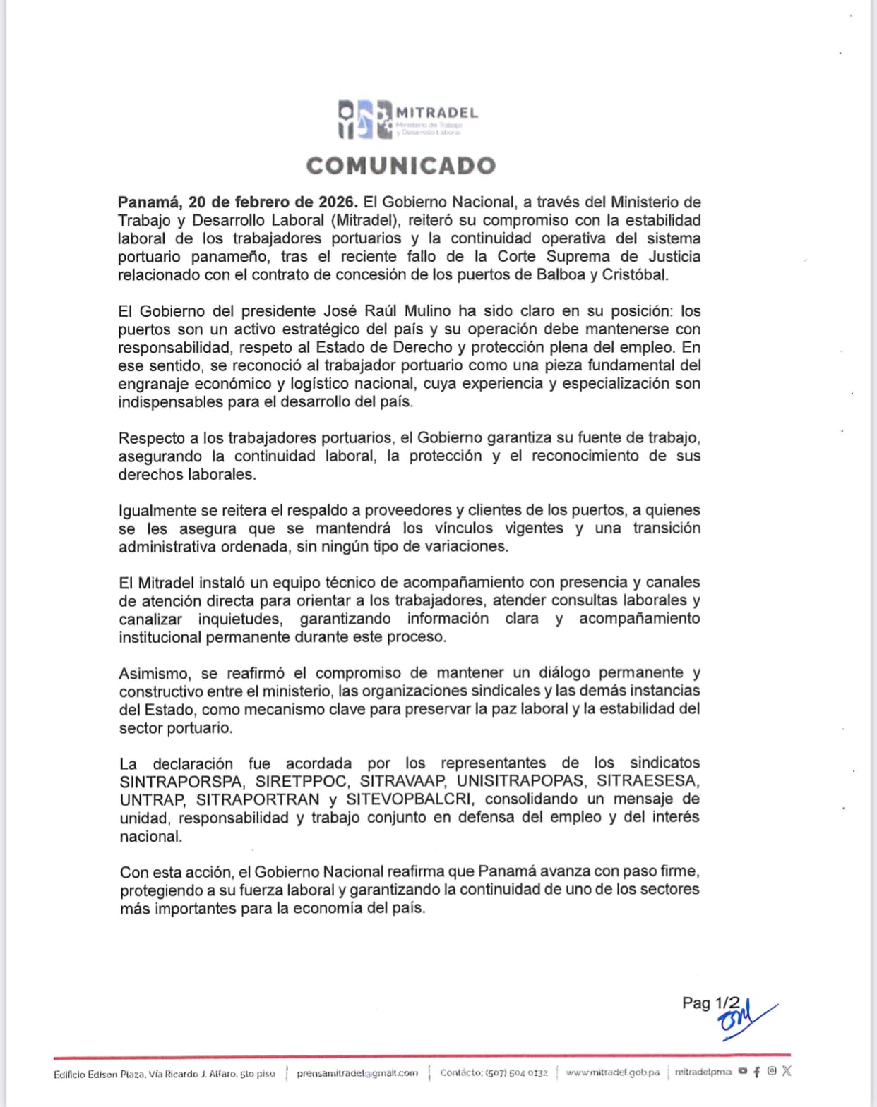 El Ministerio de Trabajo y Desarrollo Laboral (Mitradel) informó el 20 de febrero de 2026 que el Gobierno garantizará la estabilidad de los trabajadores portuarios y la continuidad del sistema, tras el fallo de la Corte Suprema de Justicia que dejó sin efecto el contrato de concesión de Panama Ports en Balboa y Cristóbal. La empresa era operada por Hutchison Ports, conglomerado con sede en Hong Kong, a través de su filial Panama Ports Company, y continuará al frente de las terminales hasta que se ejecute formalmente la decisión judicial.