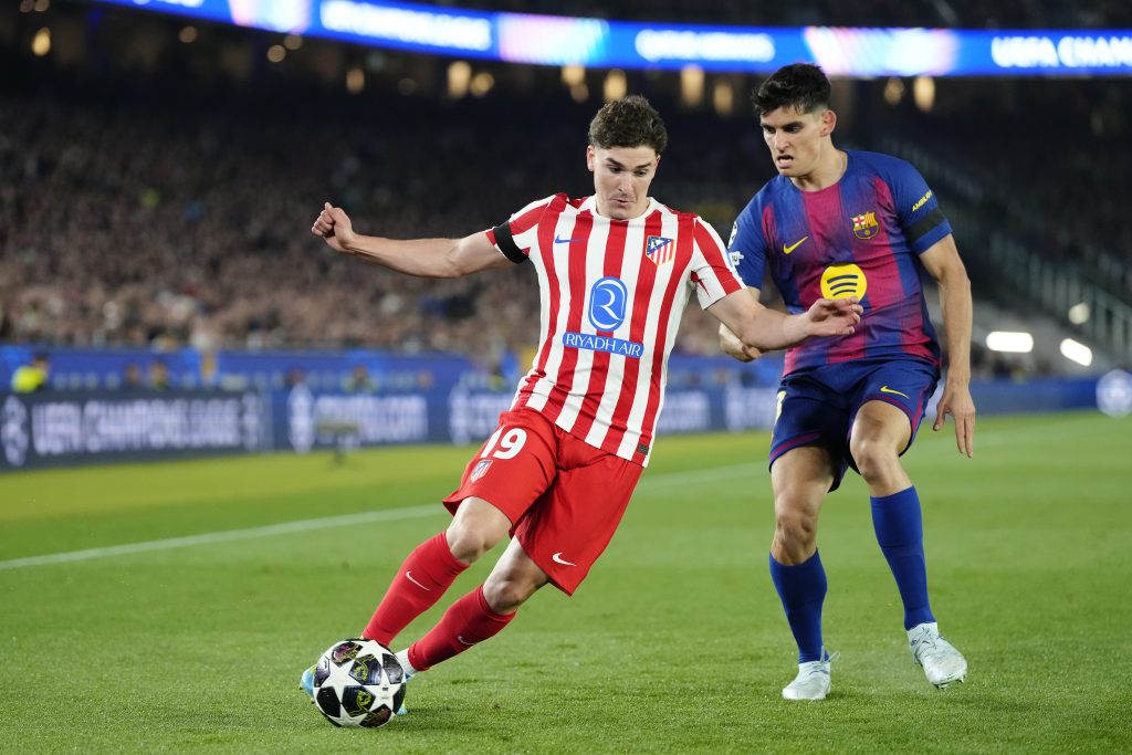 Julián Álvarez rompe el cero con un tiro libre en el Spotify Camp Nou y Atlético vence 2-0 al Barcelona en la ida de cuartos de la Champions League.