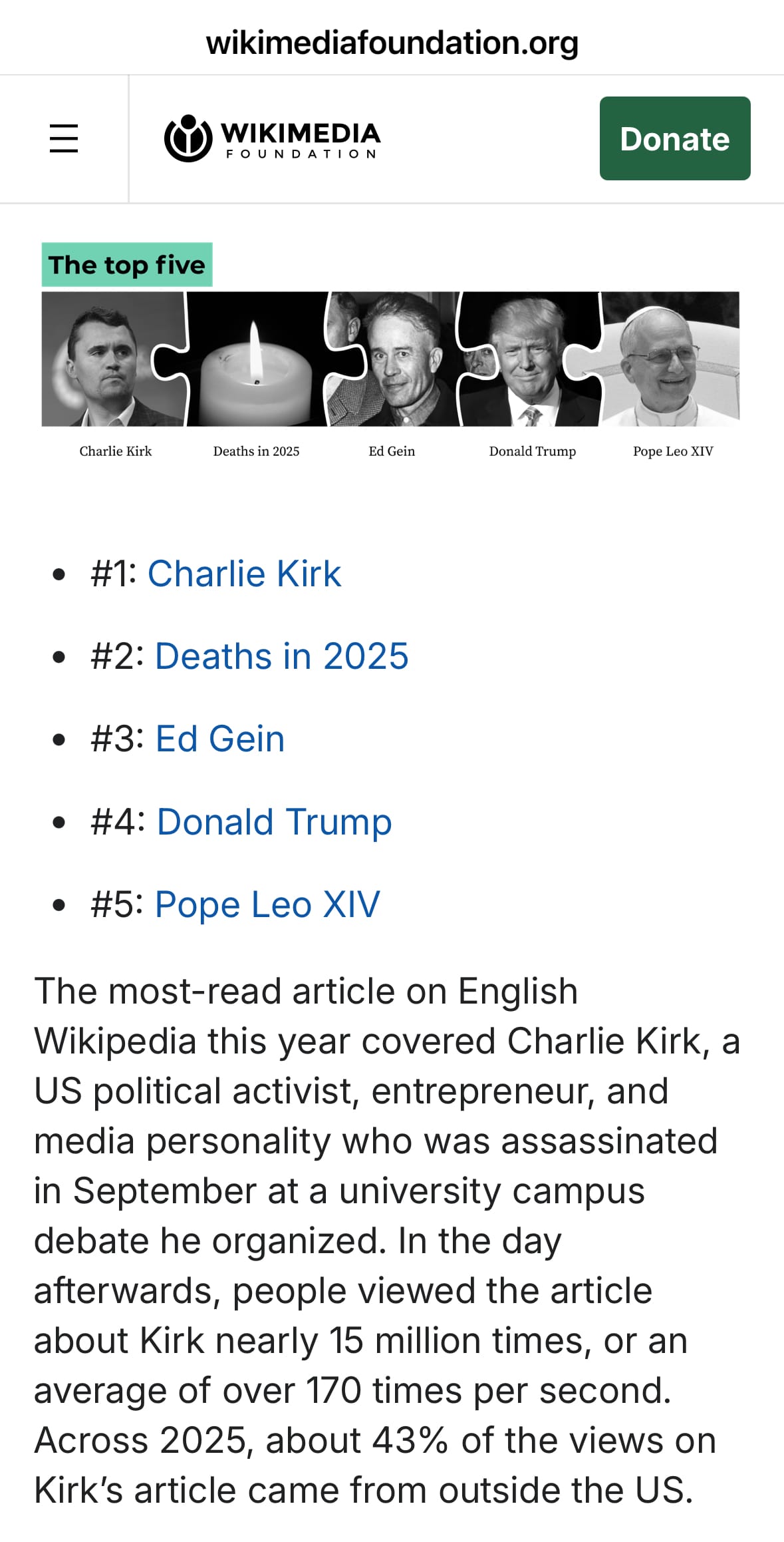 Fuente primaria: Wikimedia Foundation (https://wikimediafoundation.org/news/2025/12/02/announcing-wikipedias-most-read-articles-of-2025/)