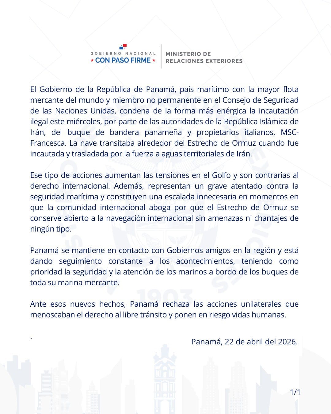 La Guardia Revolucionaria iraní incautó este miércoles el MSC Francesca, de bandera panameña, en el Estrecho de Ormuz. El Brent superó los $101 y Panamá, con la mayor flota mercante del mundo, condenó la acción como ilegal.