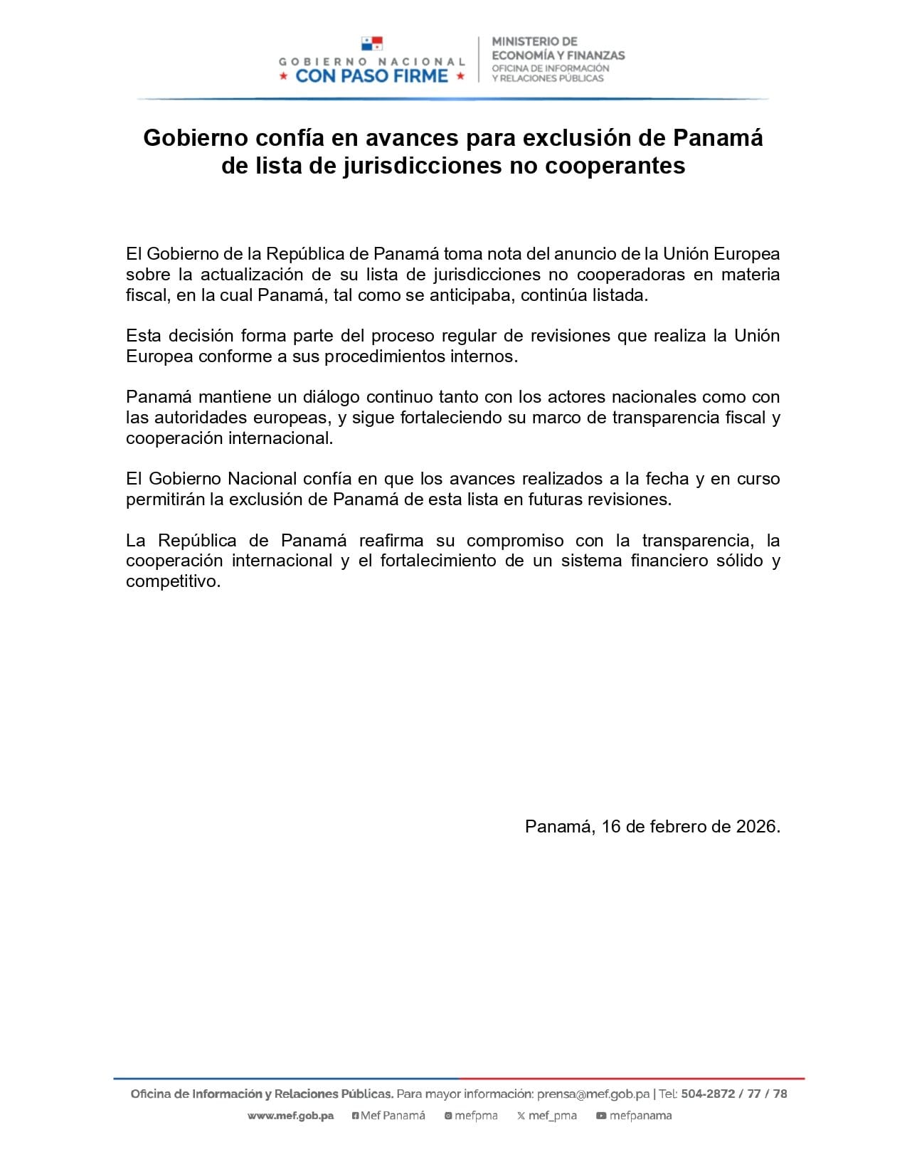 El MEF señala que la decisión forma parte del proceso regular de revisiones que realiza la UE y subraya que Panamá mantiene un diálogo continuo con autoridades europeas, además de haber fortalecido su marco de transparencia fiscal y cooperación internacional.