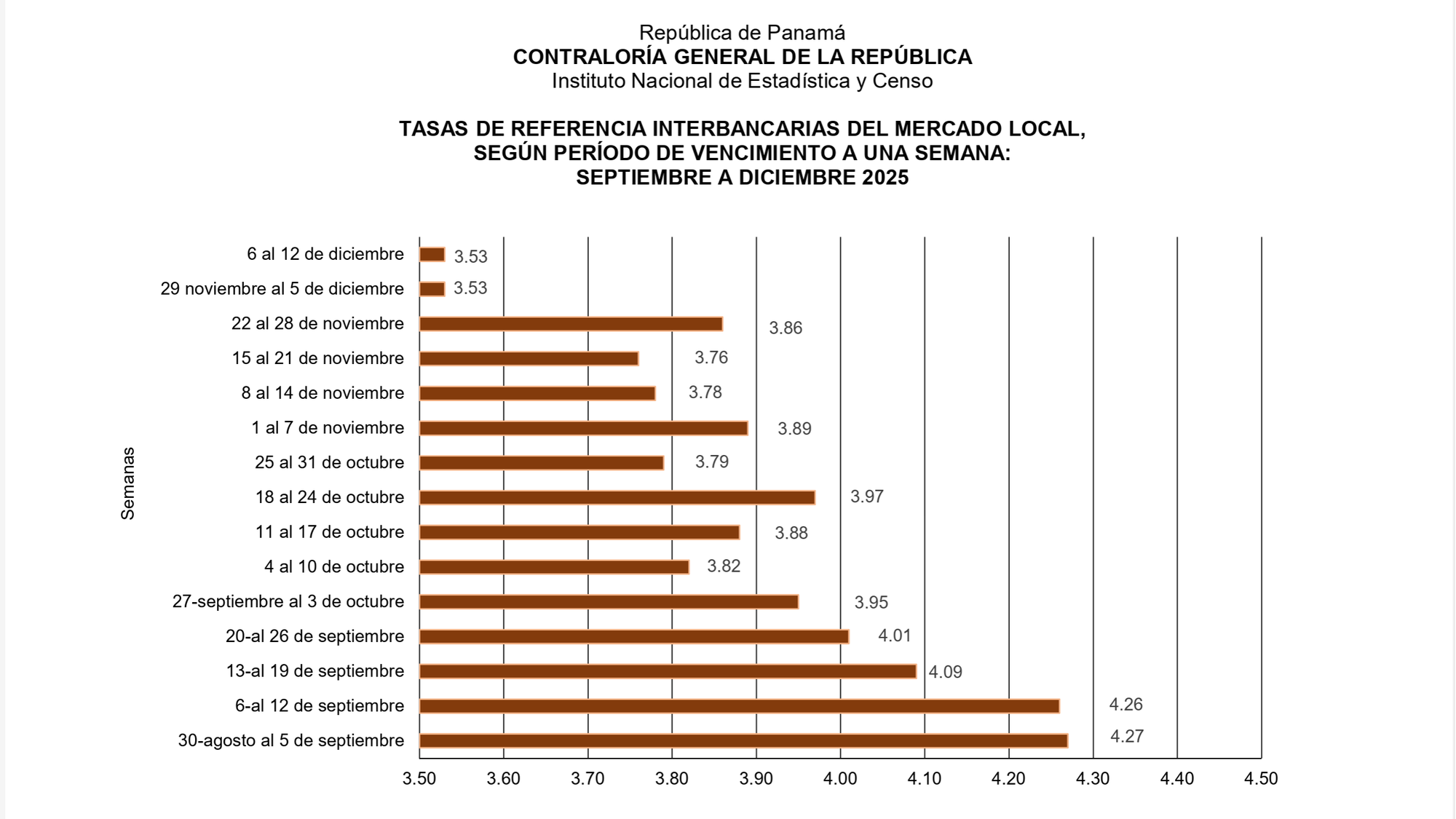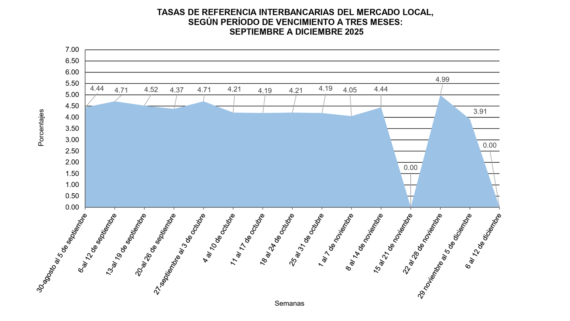 Los datos del último trimestre revelan una tendencia clara: las tasas a plazos cortos descendieron, con el interés a una semana cayendo de 4.27% a inicios de septiembre a 3.53% en la segunda semana de diciembre. En contraste, los plazos más largos mostraron inestabilidad; la tasa a seis meses, por ejemplo, alcanzó un pico de 5.11% en octubre, reflejando una mayor percepción de riesgo a futuro.