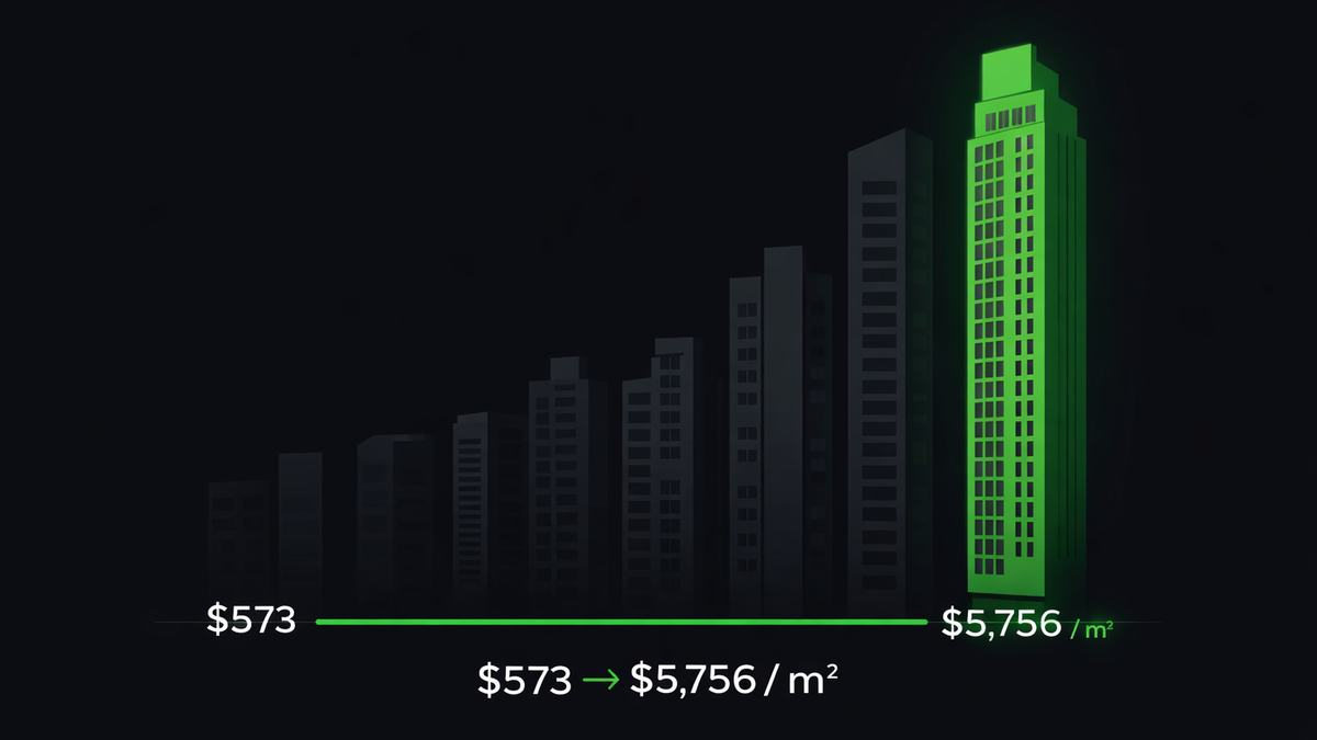 Esa diferencia se refleja en la dispersión. Santa María abre un abanico amplio de precios —desde US$2,800/m² hasta más de US$3,500/m²— mientras Costa del Este mantiene una banda definida entre US$1,200 y US$2,600/m². No apunta al segmento de lujo: se consolida en la franja media, donde la profundidad de demanda es mayor.